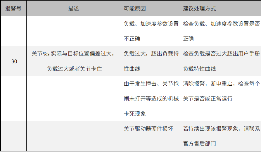 報警代碼:伺服故障碼:30,關節(jié)3實際與目標位置偏差過大,負載過大或者關節(jié)卡住