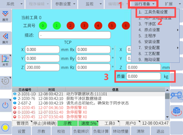 步驟一:排查機械臂負載是否設置正確。負載太大或者太小有報警30的風險。可以在運行準備界面-----工具負載設置界面,里面的質量那里檢查負載參數。再堅持程序里面指令加減速是否正常。