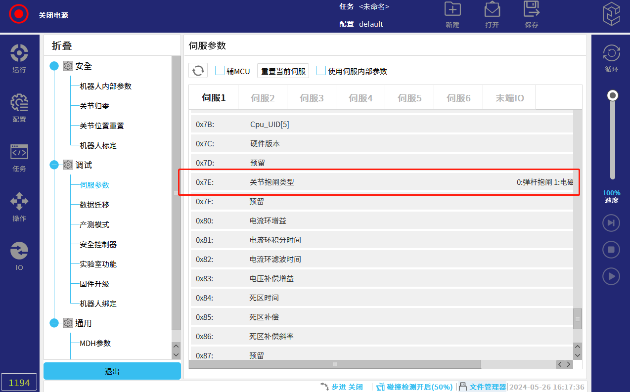 - 查看:在伺服參數(shù)界面下拉至0X7E位置,查看0X7E的值(0:彈桿抱閘,1:電磁抱閘)