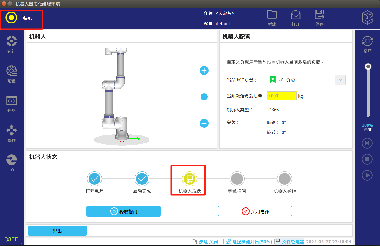 - 機器人顯示”待機“狀態(tài)后退出,進入運行頁面,切換狀態(tài)