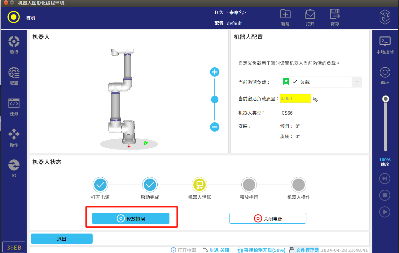 注意:操作松開抱閘時建議將機器人軟件更新至2.10.1.14以上,此版本兼容各種抱閘類型操作