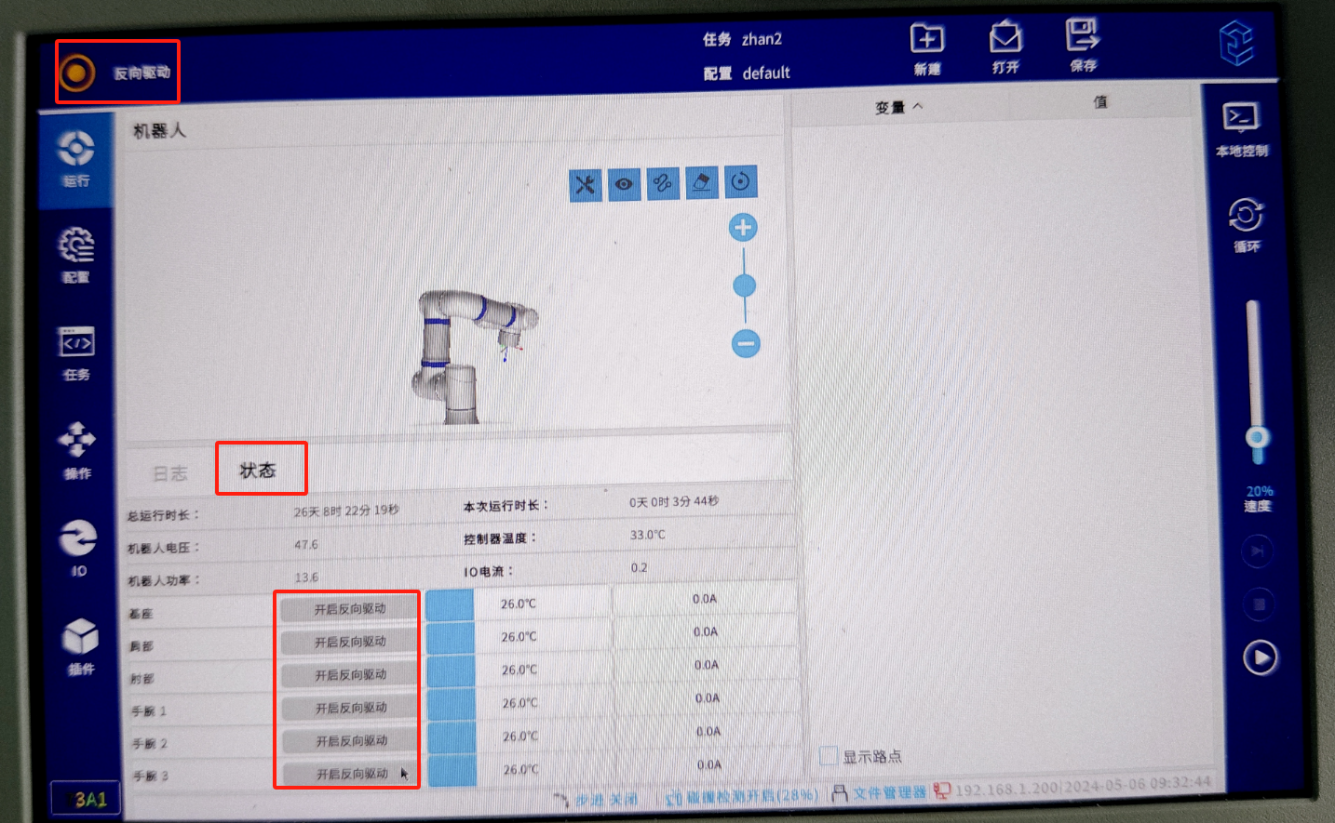 按住示教器反面的拖動使能開關(guān),機器人即進入 “反向驅(qū)動”模式。點擊開啟對應軸的”反向驅(qū)動“,