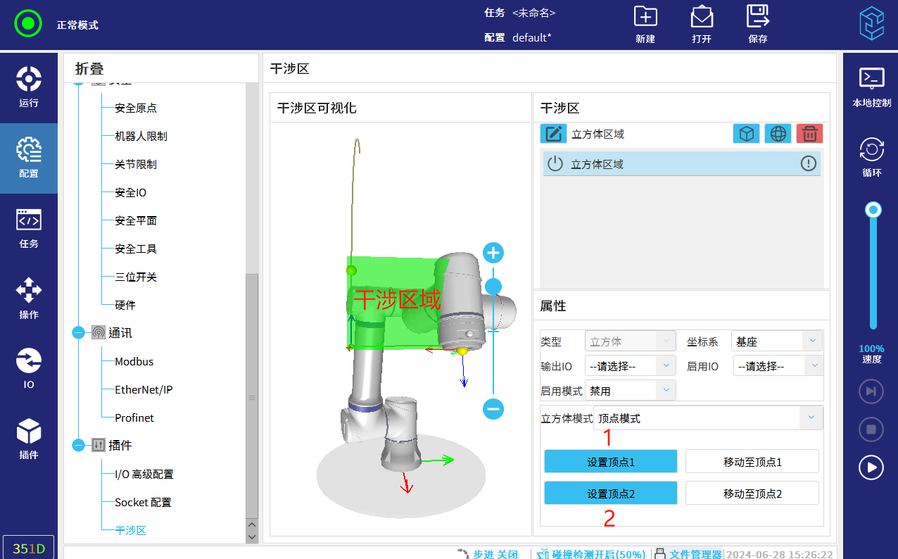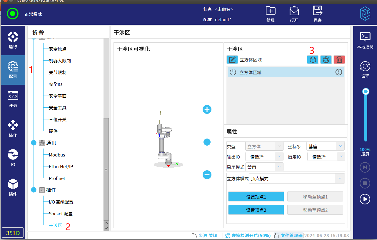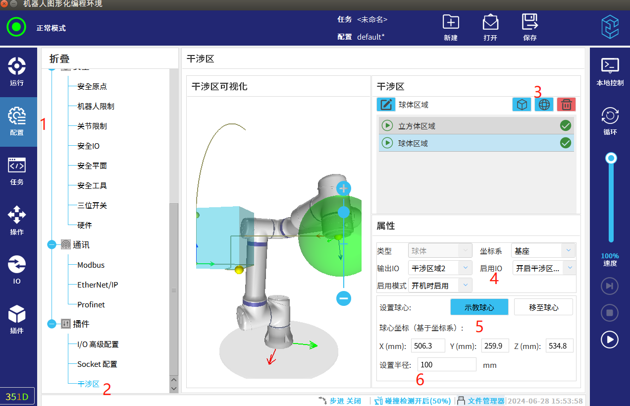 如圖2-4 配置-干涉區(qū)-添加球形干涉區(qū) -綁定DIDO-示教球心-設置球半徑