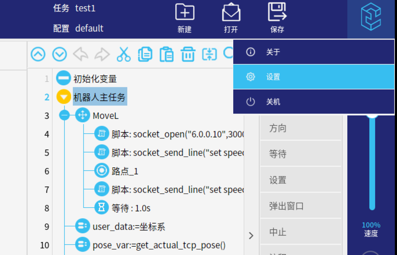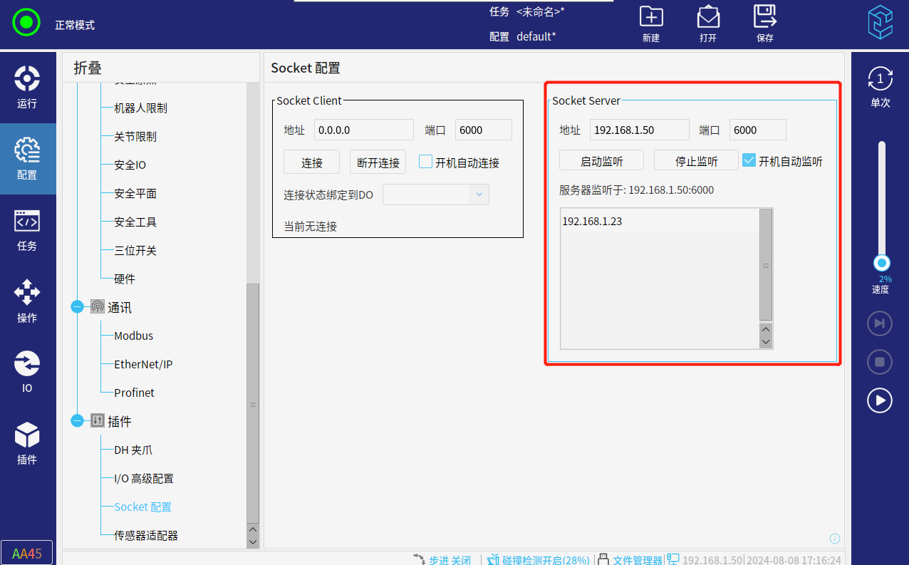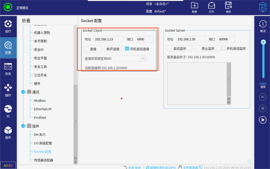 機器人本身的socket通訊只有腳本這一種方式,用戶編寫腳本通訊耗時 多,且不能開機自動連接,此插件提供用戶界面減少用戶使用socket的時間,同時提供開機自啟或自動連接的客戶端和服務器,并且提供快捷指令。