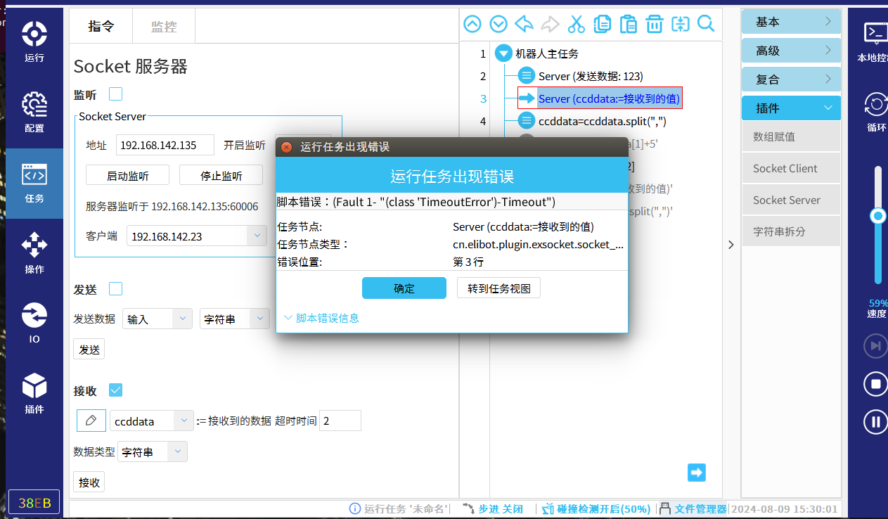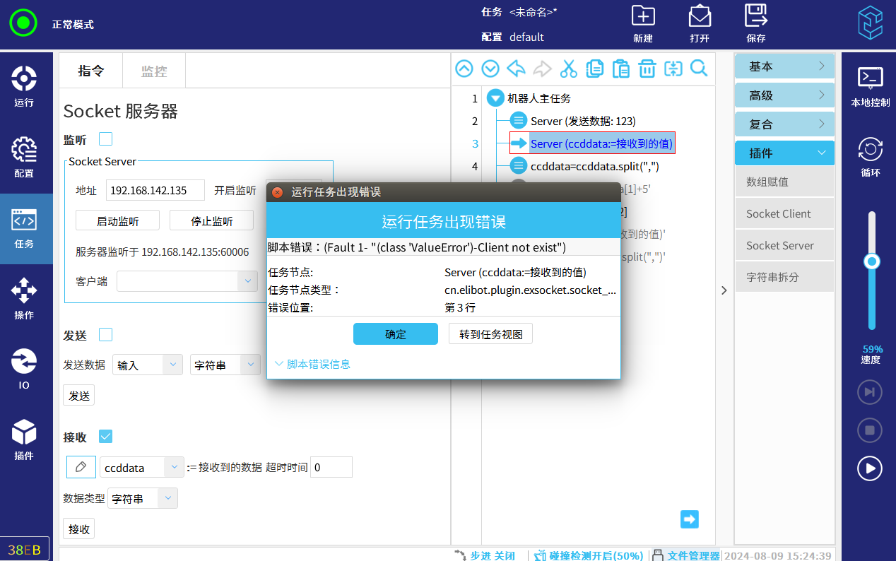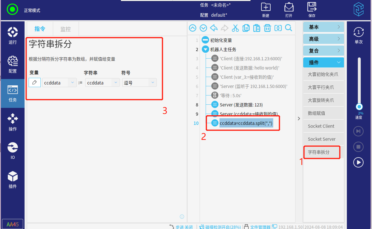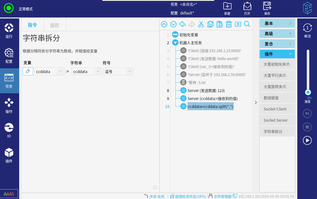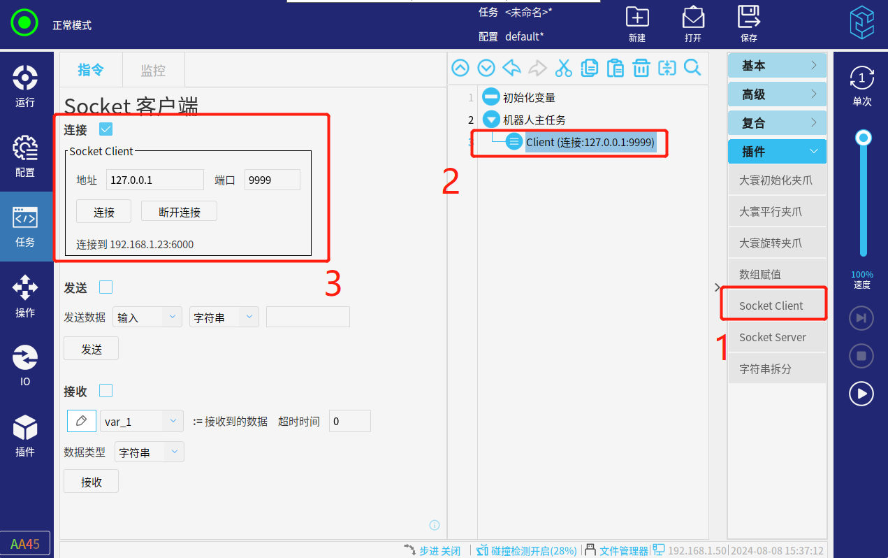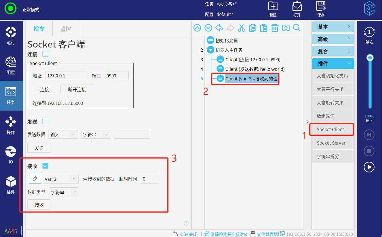 選擇導航欄“任務”-指令欄選擇“插件”-點擊"Socket Client"-設置該指令(勾選“連接”-輸入對應的服務端地址,端口號,“運行”或點擊"連接"即可)
