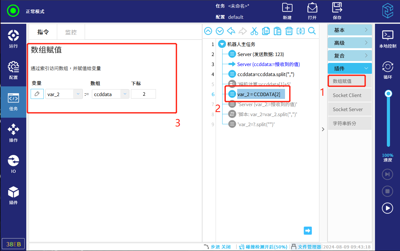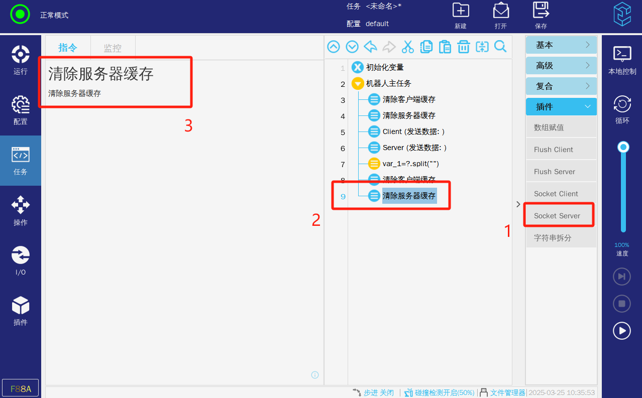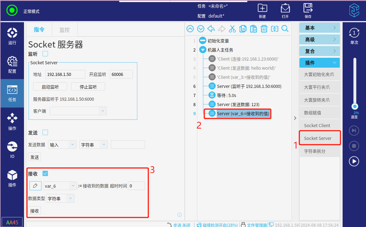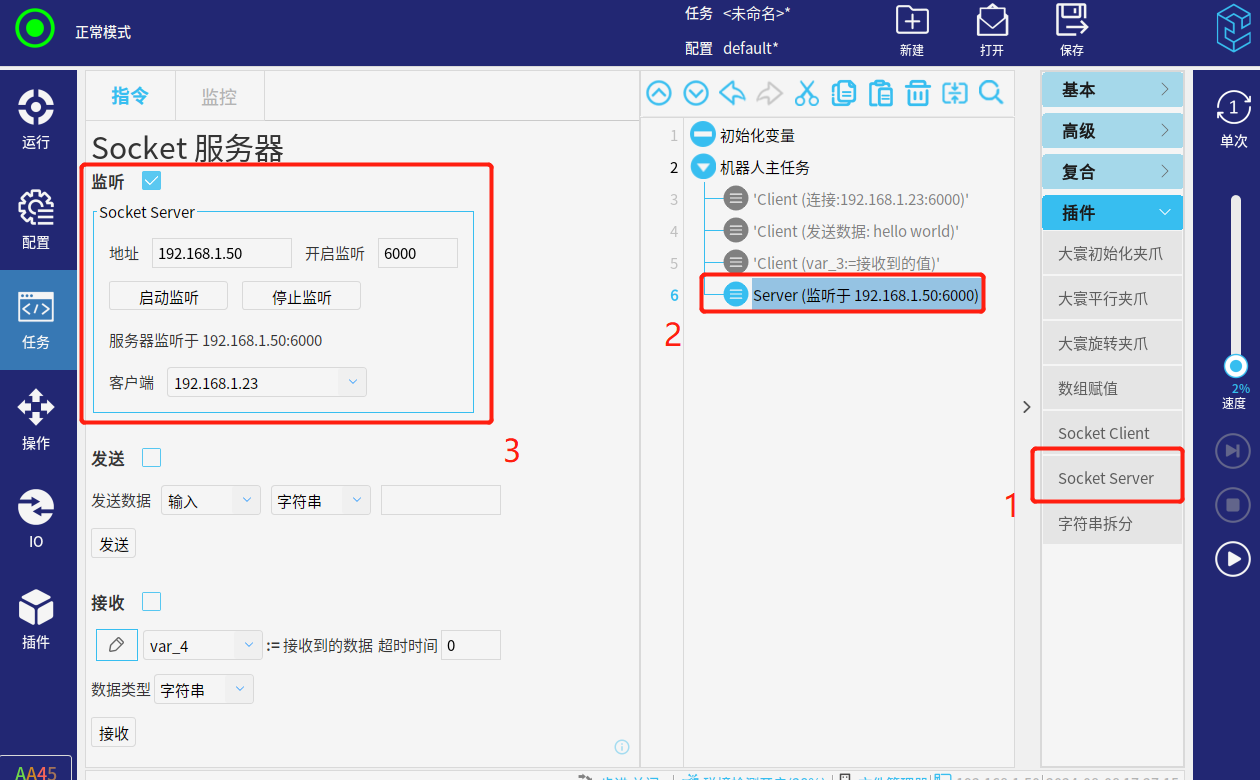 選擇導航欄“任務”-指令欄選擇“插件”-點擊"Socket Server"-設置該指令(勾選“接收”-輸入對應的數據類型)可以手動點擊”接收“,也可以直接”運行任務“來接收