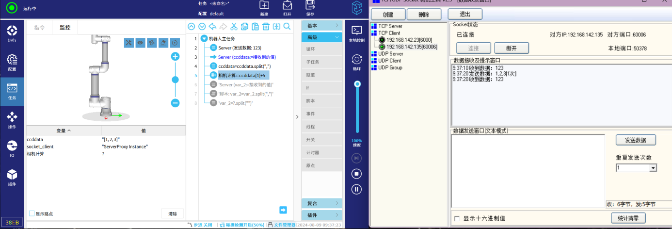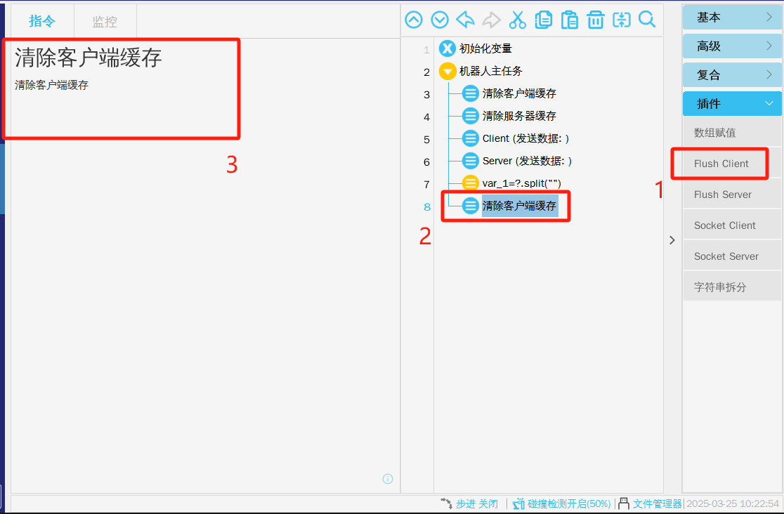 選擇導航欄“任務”-指令欄選擇“插件”-點擊"Socket Client"-設置該指令(勾選“發送”-輸入對應的數據類型)可以手動點擊”發送“,也可以直接”運行任務“來發送