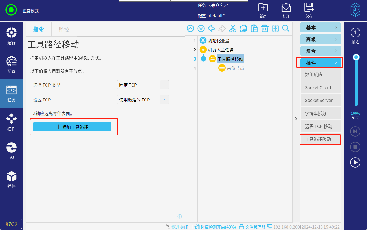 3.以上操作完成后,就可以運行程序了。初次運行,速度百分比調低一點,插件參數設置的不對,運行過程中可能會有抖動。