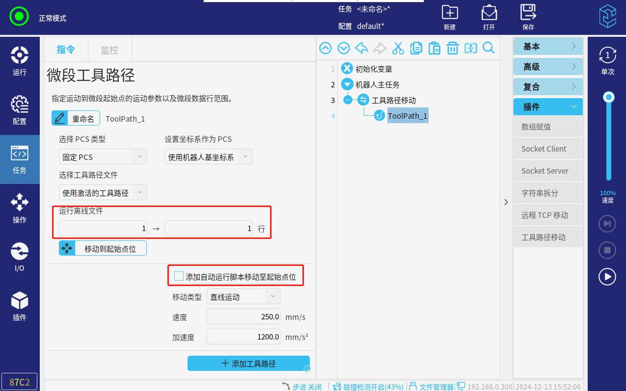 2.在運行離線文件處,可以修改ml文件一共要運行幾行,從第幾行開始運行。點擊添加自動運行腳本移動至起始點位,運行程序時,會運動到ml文件中起始行的位置。
