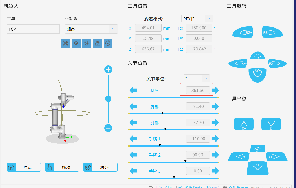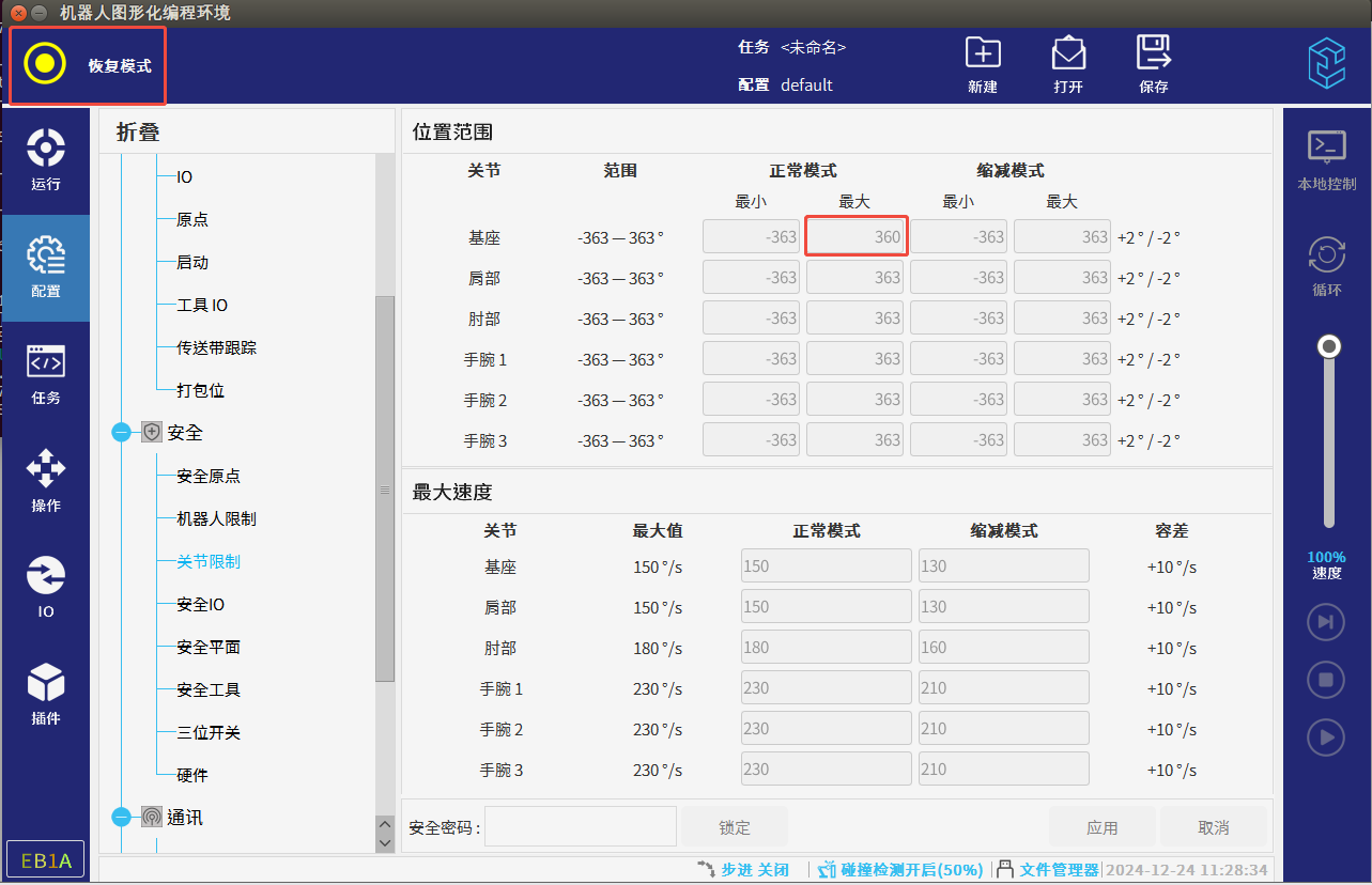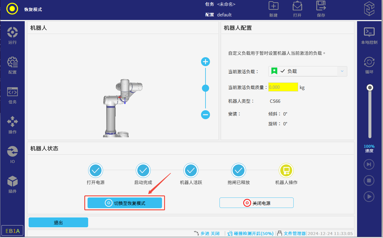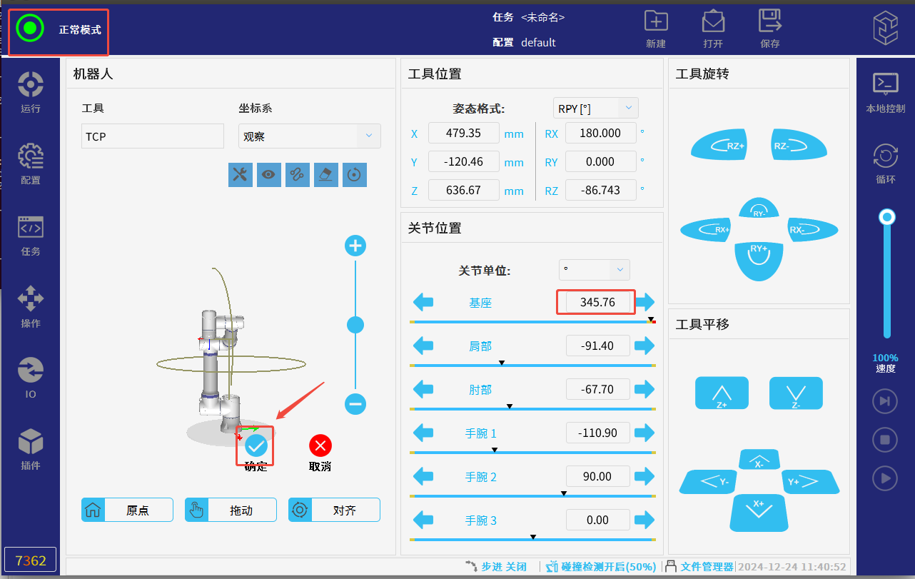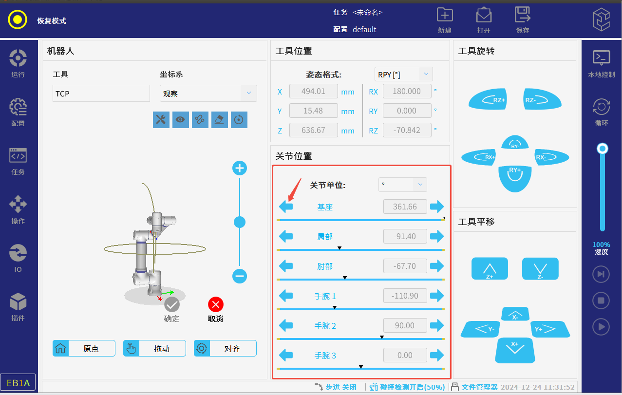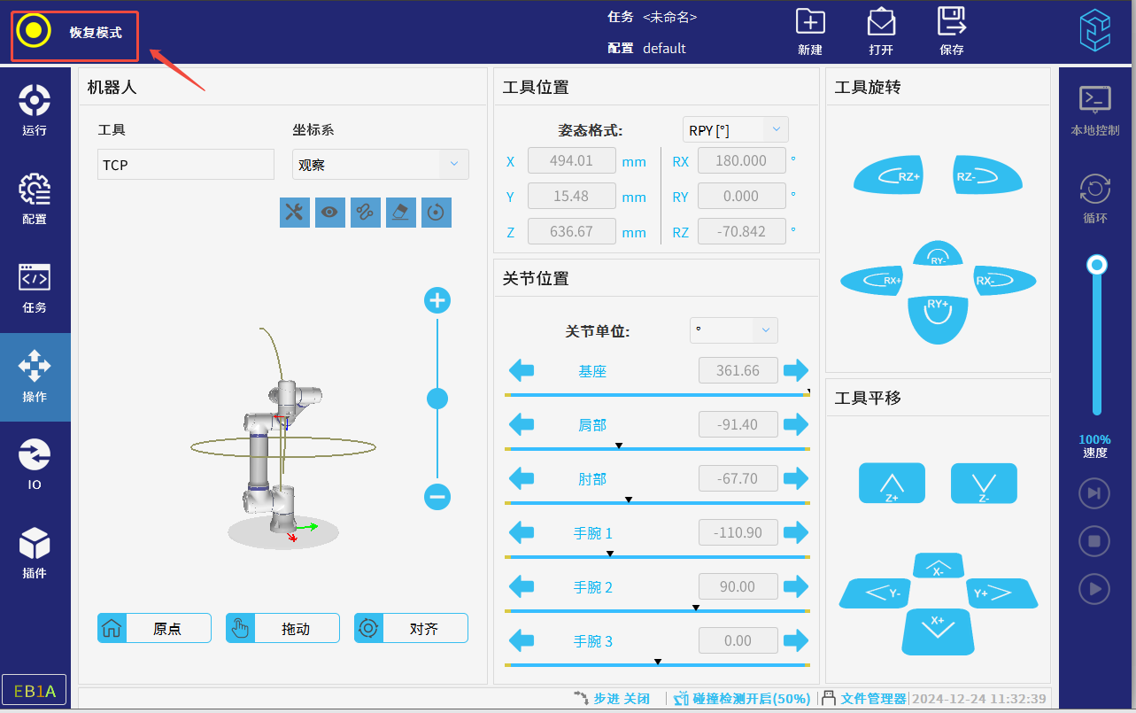 此時(shí)機(jī)器人的基座已經(jīng)在關(guān)節(jié)限制內(nèi),左上角恢復(fù)正常模式,點(diǎn)擊確定按鈕即可退出恢復(fù)模式