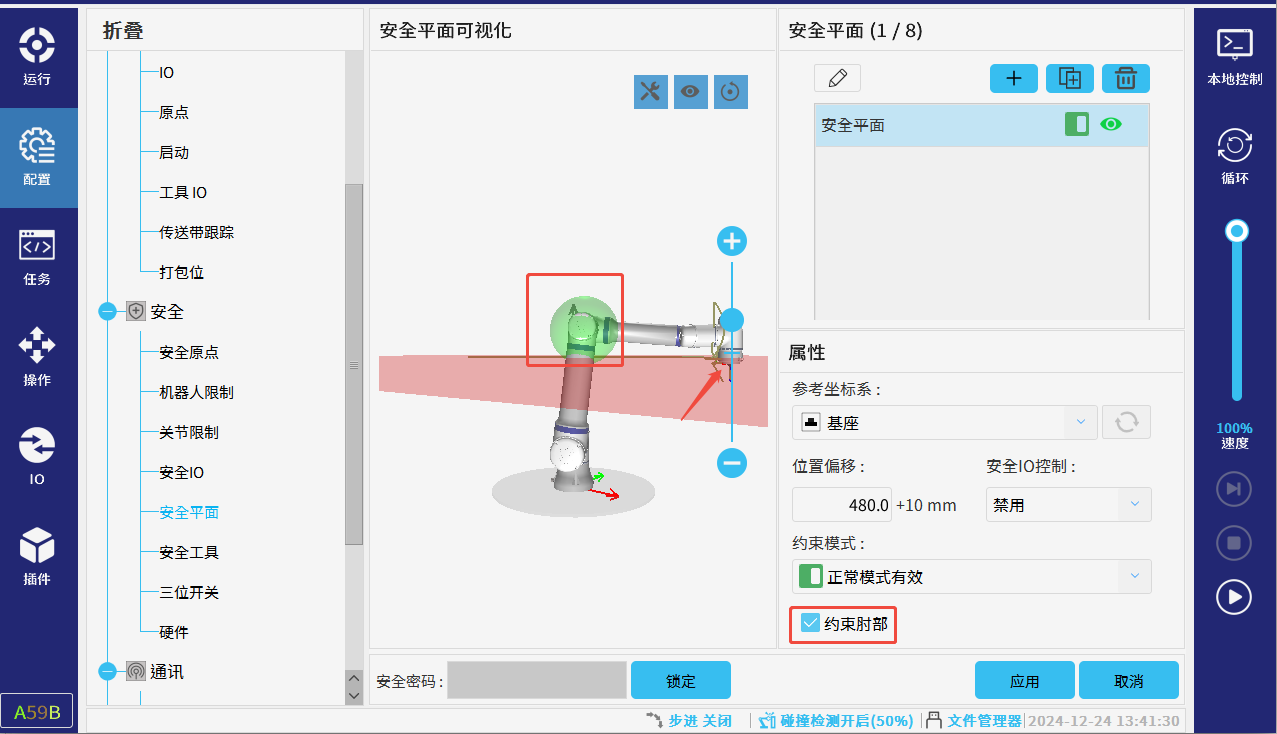 設(shè)置安全平面時(shí)可以選擇勾選或者不勾選“約束肘部”(勾選了會在肘部有個(gè)球體),如果勾選了則需要把肘部連同末端TCP一同脫離安全平面,如果沒有勾選則只需要把末端TCP脫離安全平面,操作方法如同2.1