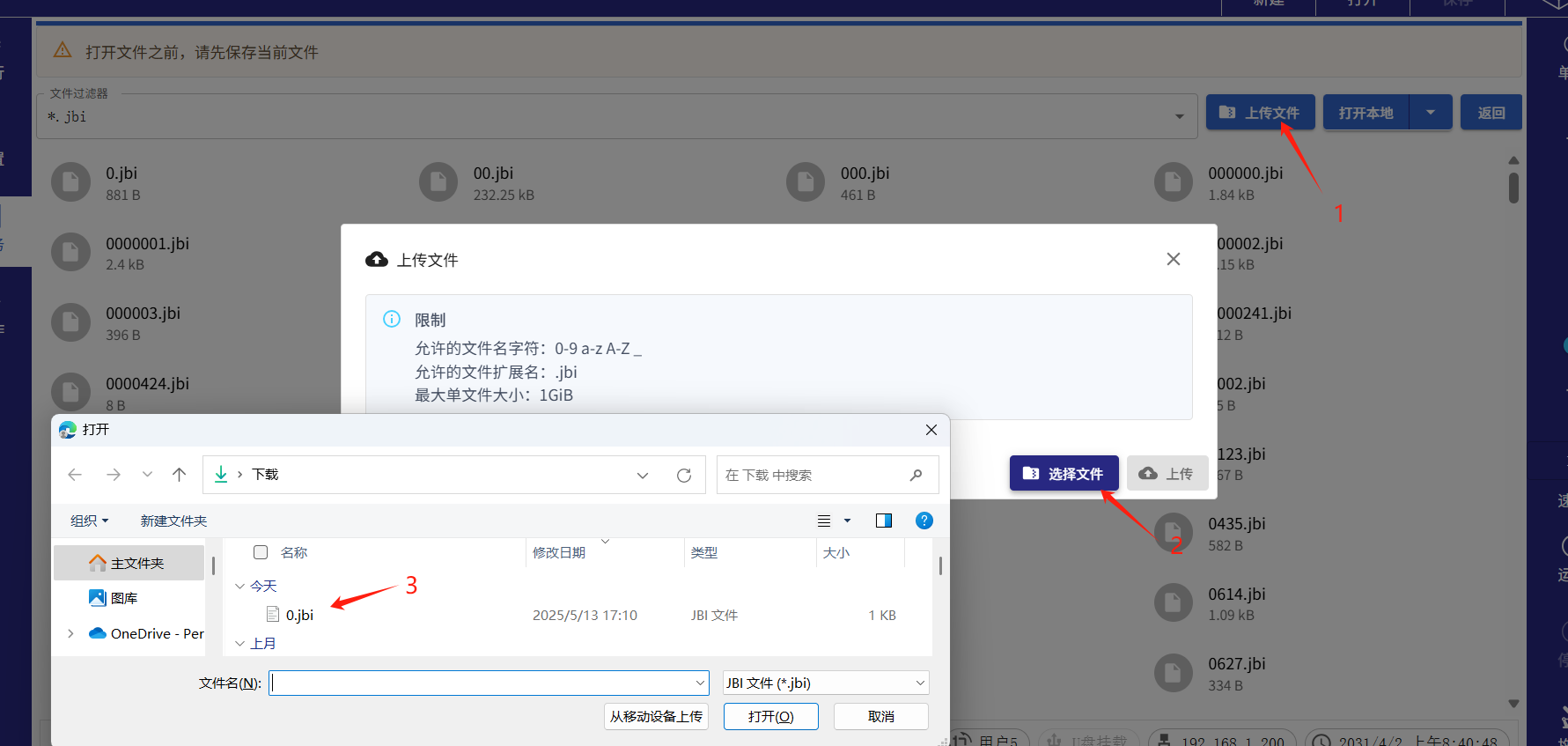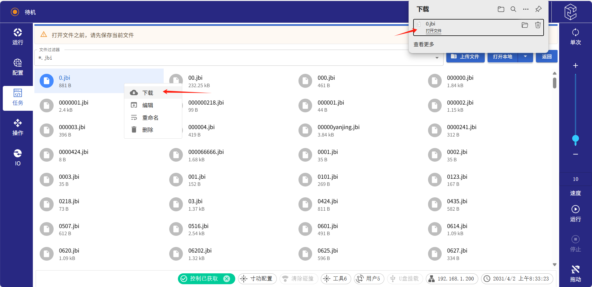 ● 備份:點擊右上角“打開”,進(jìn)入文件頁面。如下圖顯示JBI文件,找到對應(yīng)JBI文件名,鼠標(biāo)右鍵選擇下載。