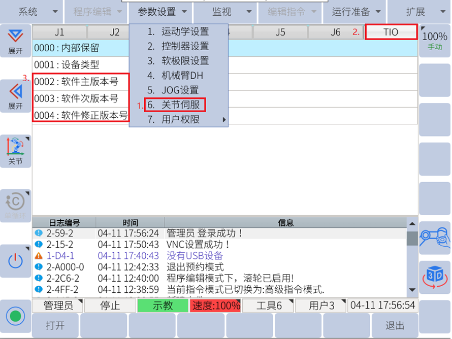 依次查看0002,0003,0004分別有數(shù)字,如0002:8,0003:2,0004:1209則此末端工具 IO版本為 V8.2.1209