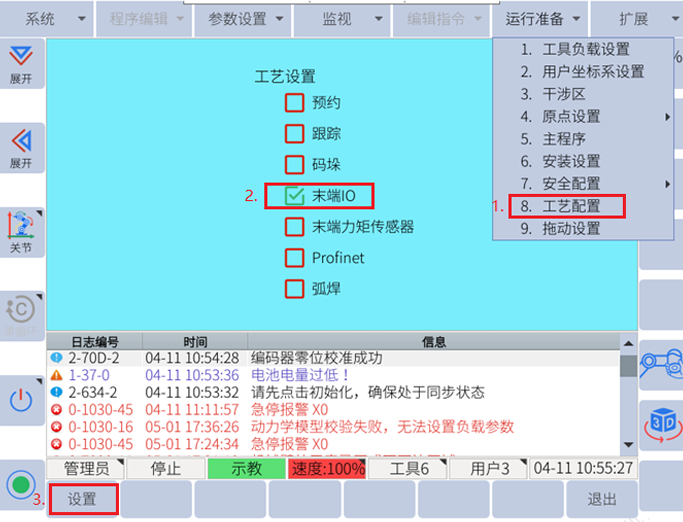 運行準備-工藝配置-勾選末端IO-設置,重啟后生效(注意:不要勾選末端力矩傳感器)。