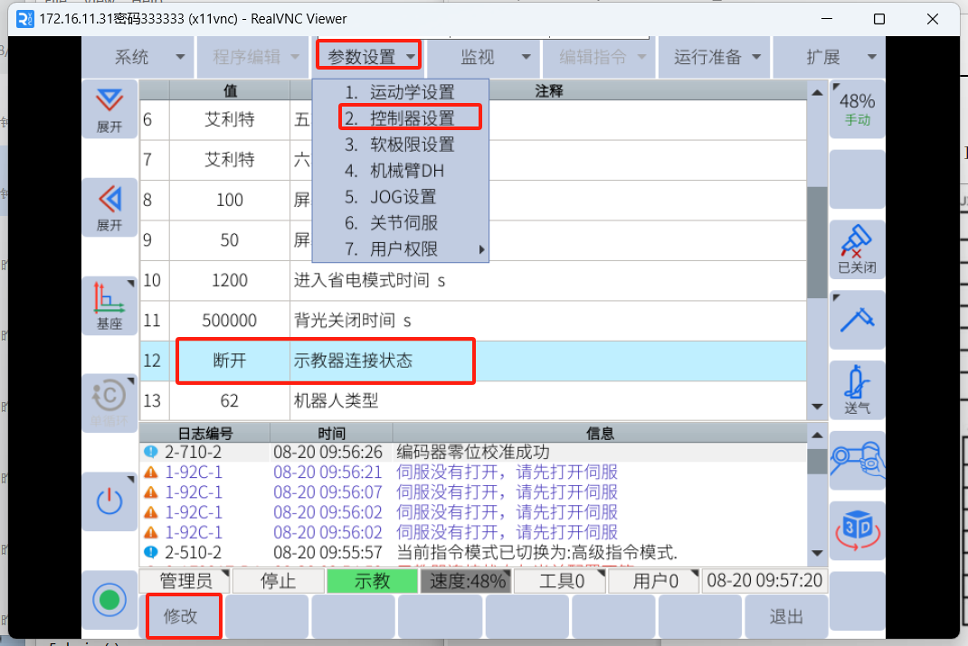 示教器上帶有兩路急停信號(hào),如果需要拔掉示教器。先要在示教器上將示教器關(guān)閉。