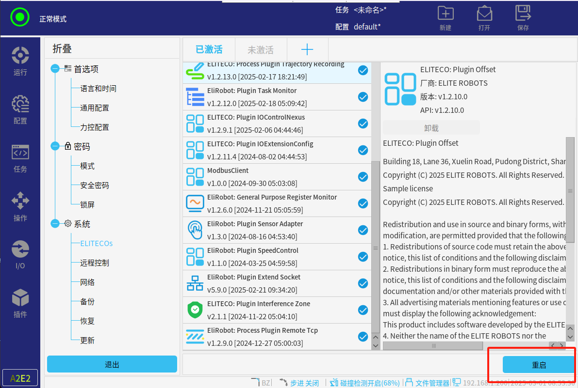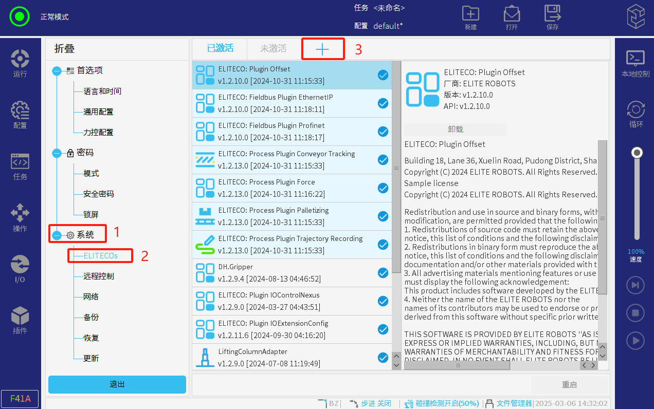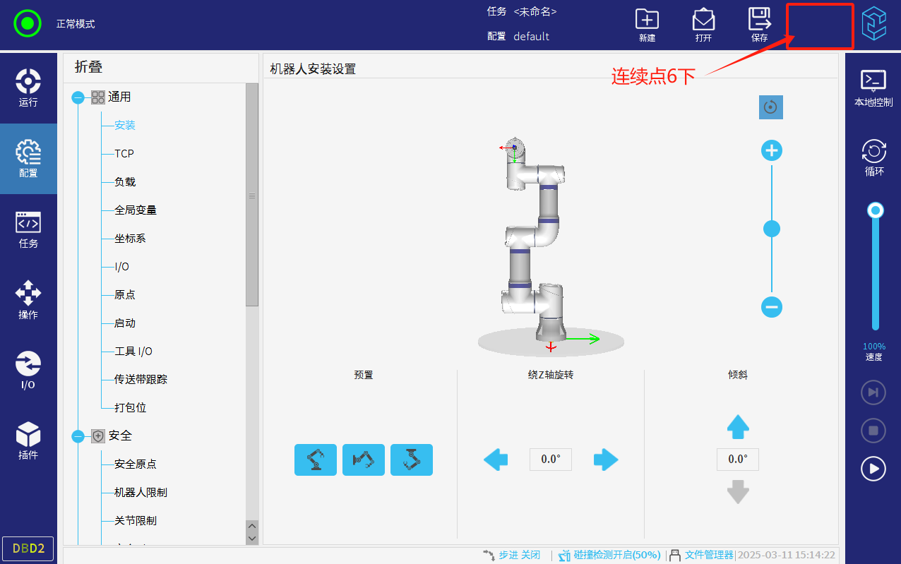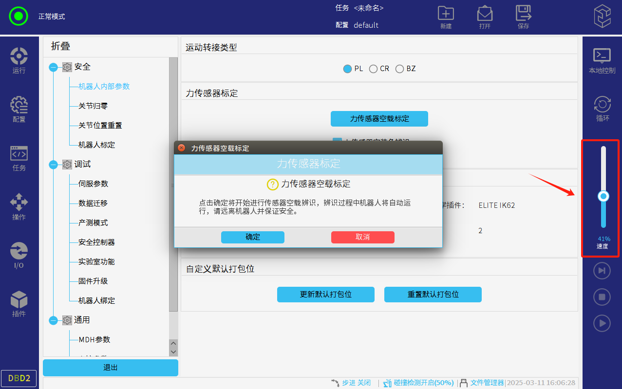 當確認機器人活動空間安全,以及力傳感器適配器上有數據顯示后,進入專家模式;密碼elibot。