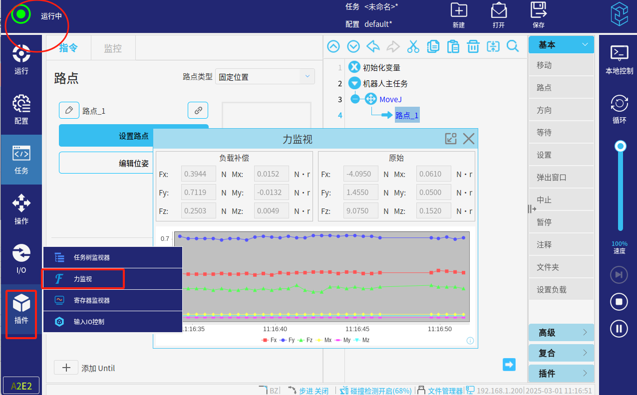 在連接成功后,在機器人左側導航欄的插件圖標內會有一個力監控選項,在機器人任意狀態下都可以監視當前力傳感器的數據。(即使在任務運行中)