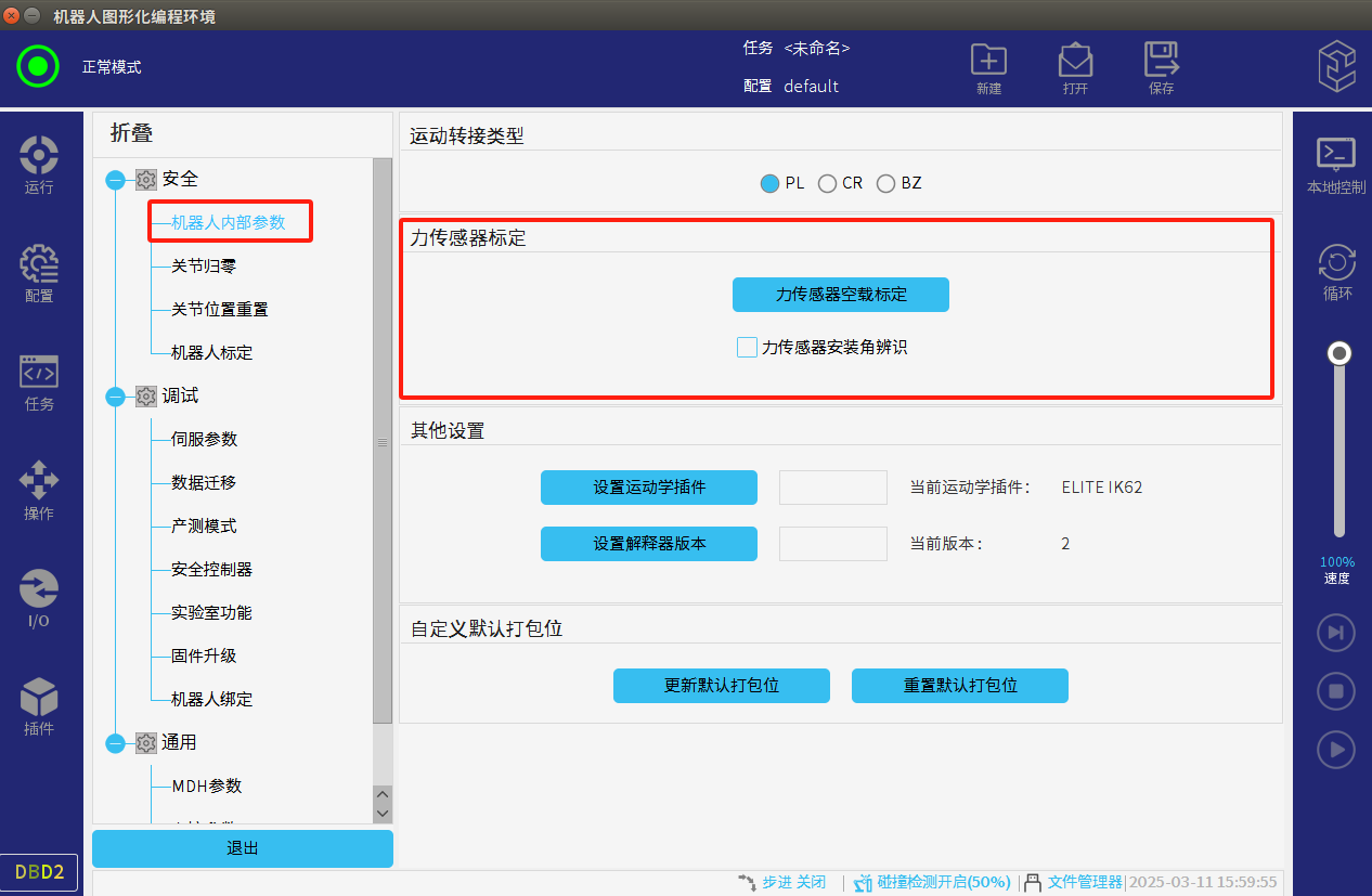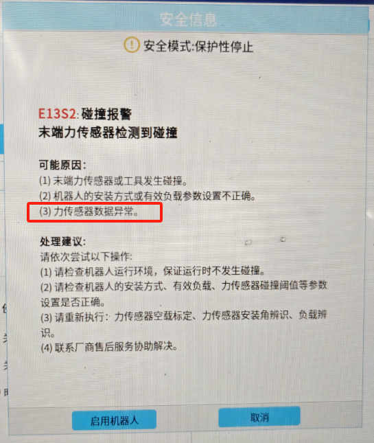 注意:啟用該功能必須開啟機器人碰撞報警功能。在機器人原本碰撞報警的功能上增加了力傳感器碰撞檢測功能,報警內容一致。