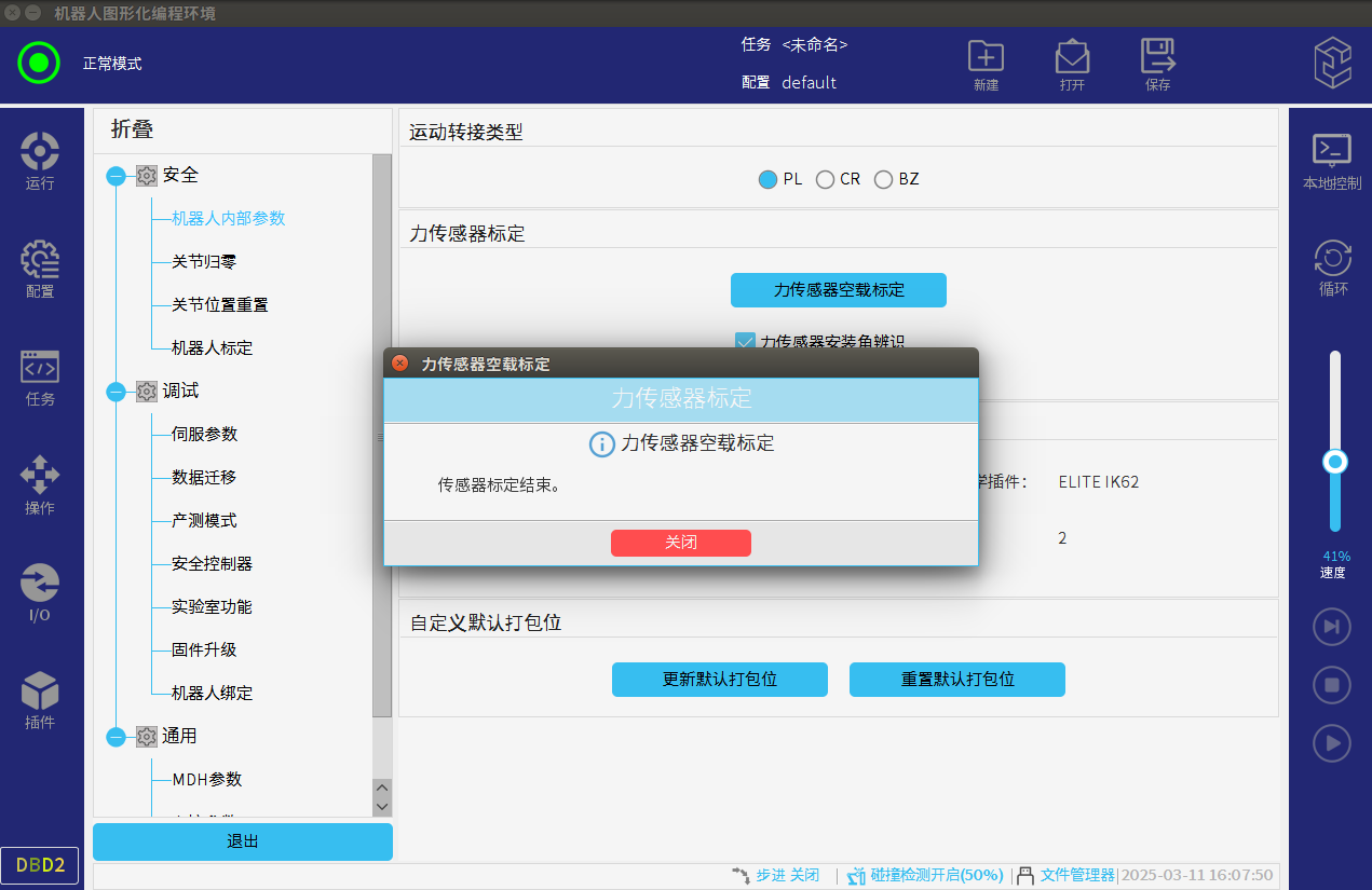 注意:力傳感器標定需要一定空間,不能在末端安裝除力矩傳感器外任何裝置;機器人在力傳感器標定的時候會運動。