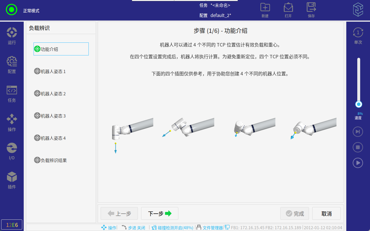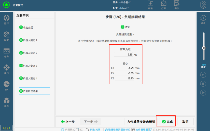 在負載辨識界面按功能介紹示教4個機器人姿態,可自動算出機器人負載;點擊完成即可。