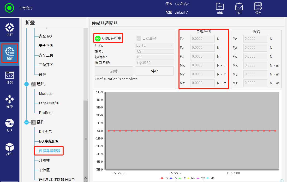 如果配置正確,點擊啟動后負載補償、原始和數據圖上會顯示當前的力矩數據。如果沒有數據顯示;則上述配置流程有選項配置錯誤,連接失敗。
