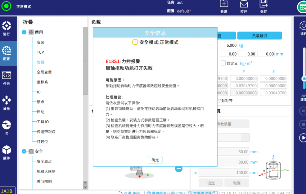 勾選后,當力傳感器檢測到多個方向的合力大于設定的碰撞力閾值時,機器人會報碰撞報警。如下圖;