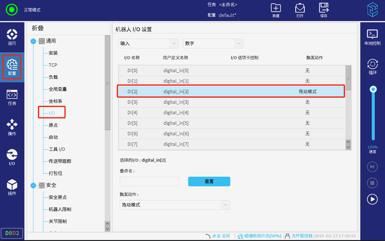 設置完成后,點擊示教器上自由拖動按鈕、示教器頂端實體按鈕和機器人末端藍色按鈕均可以實現鎖軸拖動。也可以在機器人I/O里配置數字IO和布爾寄存器打開拖動功能。如圖下;