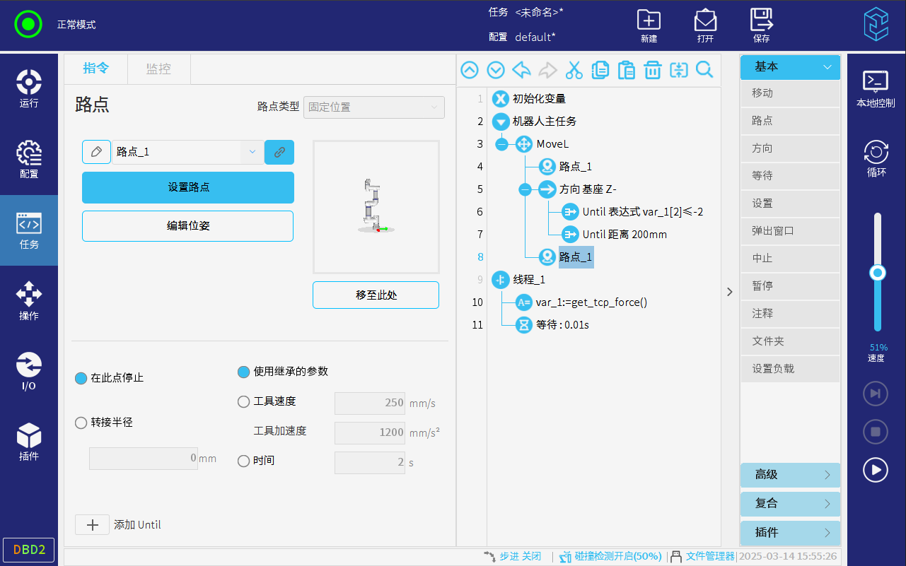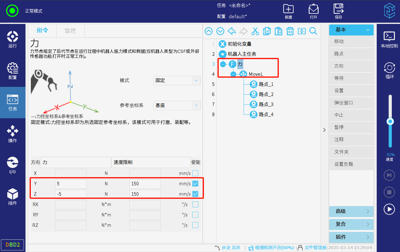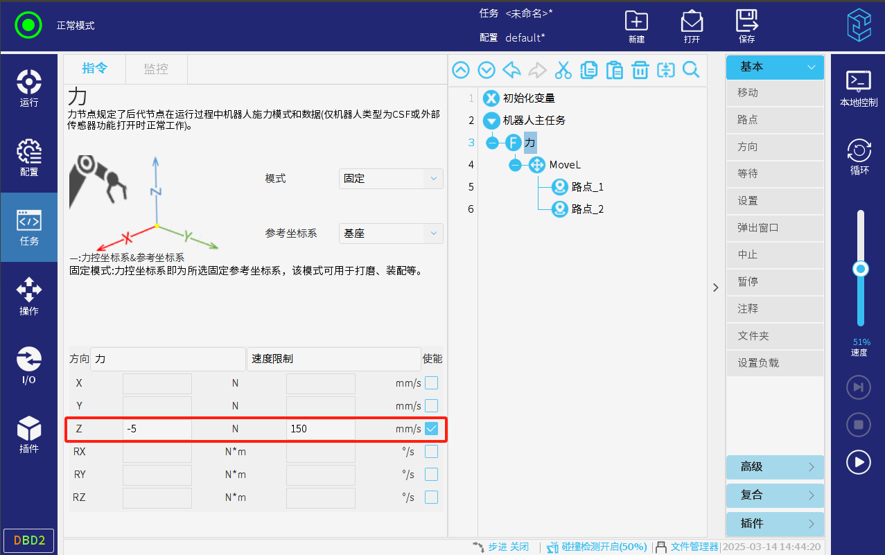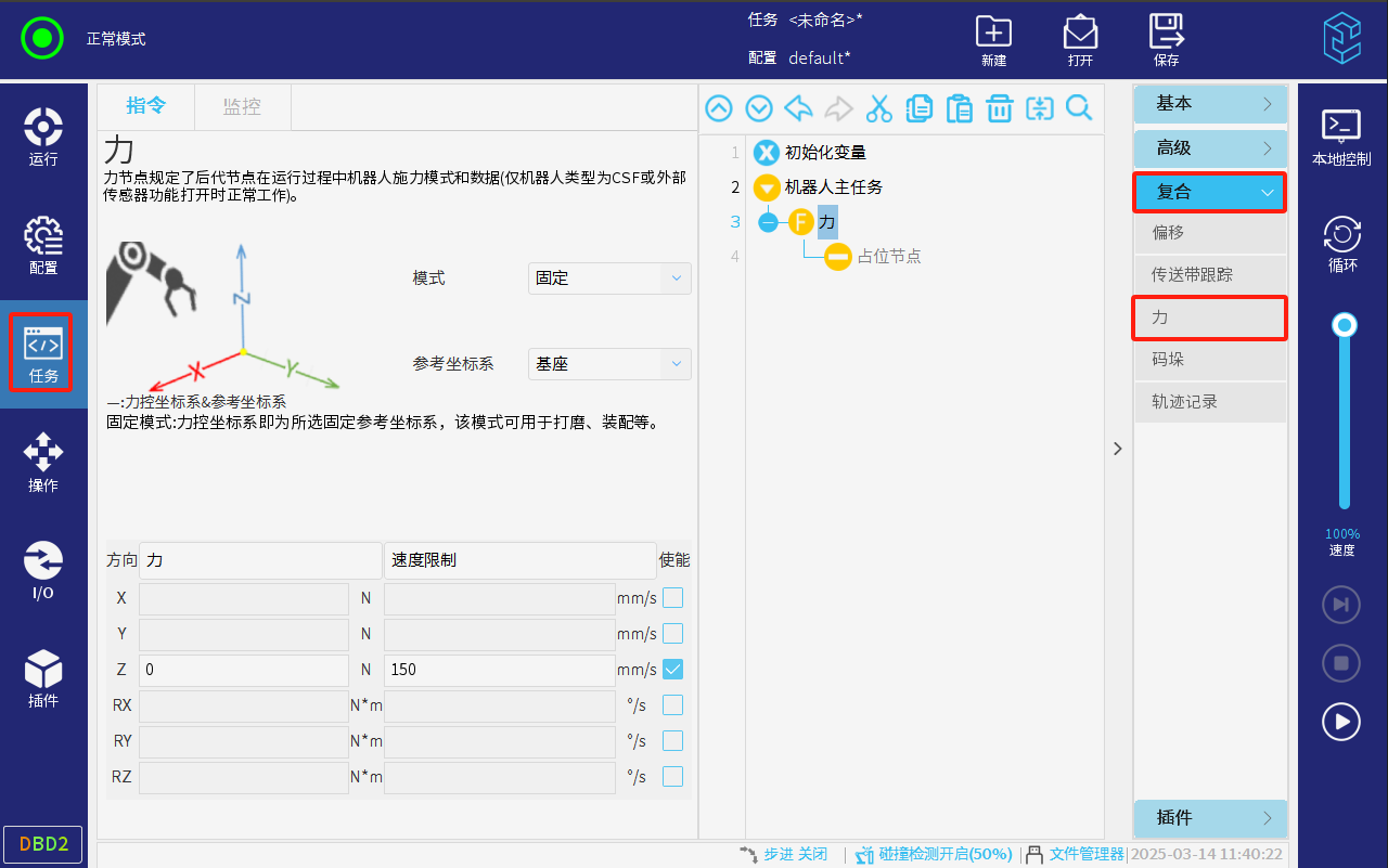 新建或打開已有的任務,點擊右側指令欄的復合-力可以添加力指令