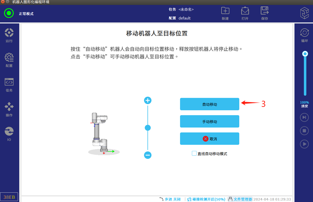 ● 進入如下圖頁面,長按自動移動。(長按自動移動之前,確保周圍無干涉。如果有干涉先移動空曠地區,再重新對齊)