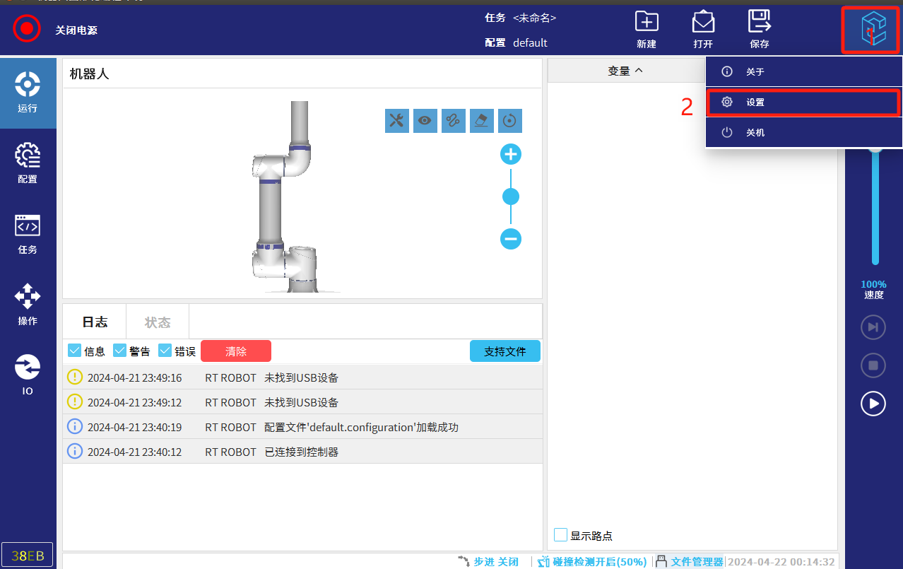 將下載完成的 EUP 格式文件放進 U 盤中,然后將 U 盤裝載至示教器上。在主界面進入設置。