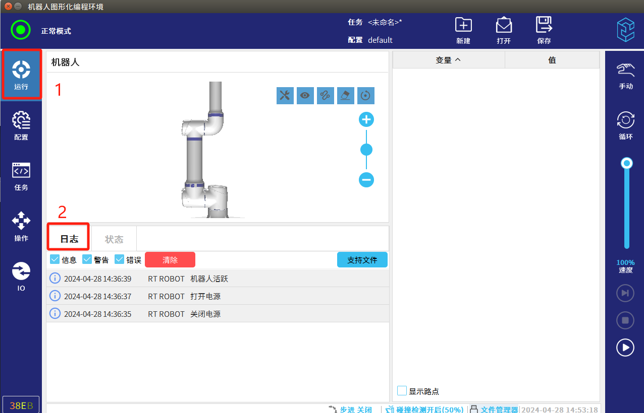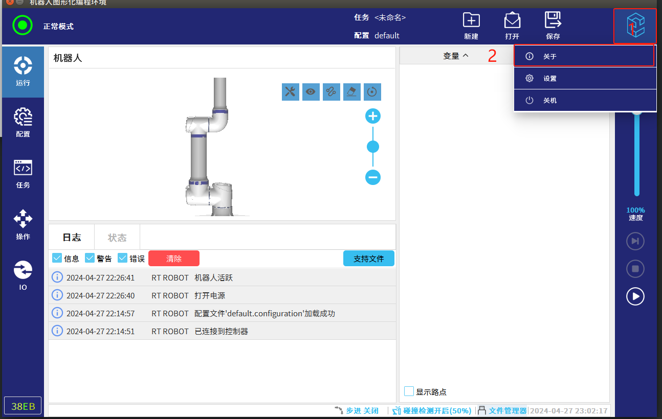 調試階段建議全部勾選進行升級,也可單獨勾選應用升級(應用:系統版本,一般是解決應用軟件的bug和界面優化;MCU: 指伺服升級;驅動IO:指末端IO的升級)。點擊“是”,會自動進行更新系統;請勿操作機器人或將其斷電。等待更新后重啟。