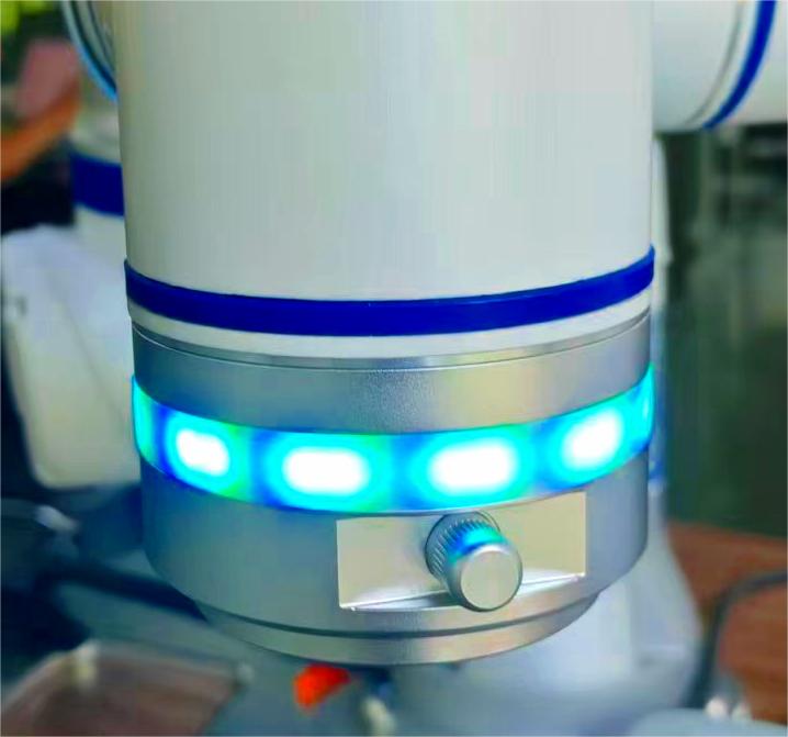 4. 如果機械臂進入縮減模式,右上角會變成黃色指示按鈕,機械臂末端法蘭指示燈會變為綠藍交替燈狀態。