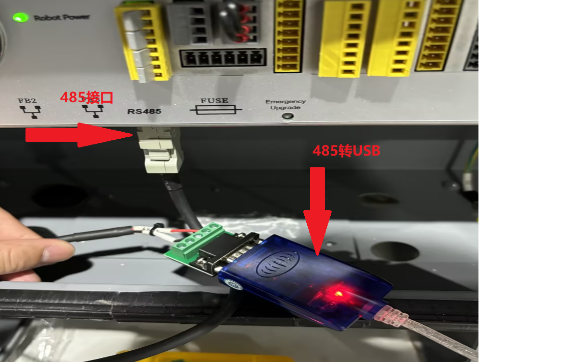 通過485 轉 USB通訊線用于電腦端與機器人模擬通訊,實際接線可直接接入設備 RS-485 正負端。