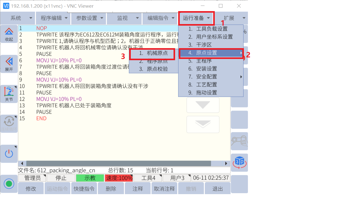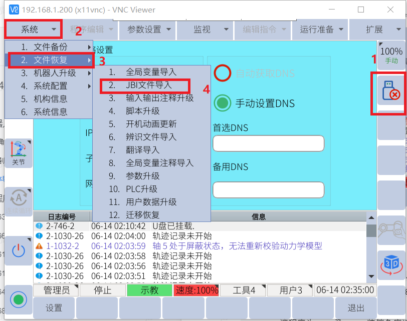 將對應機型打包程序文件放置u盤rbctrl文件夾里,U盤插到控制柜USB接口確認U盤識別成功如圖標簽1,示教器界面打包程序?qū)肴?.34步驟操作如下