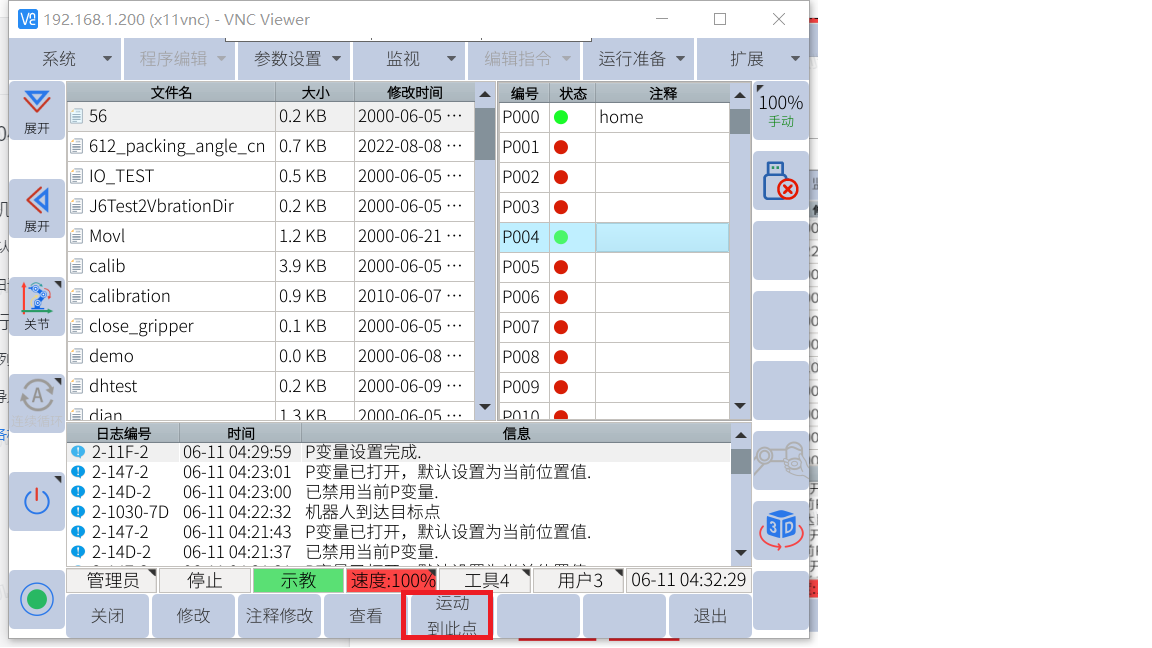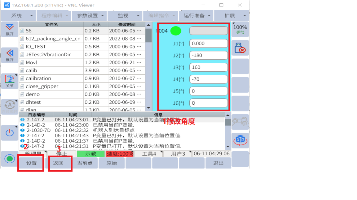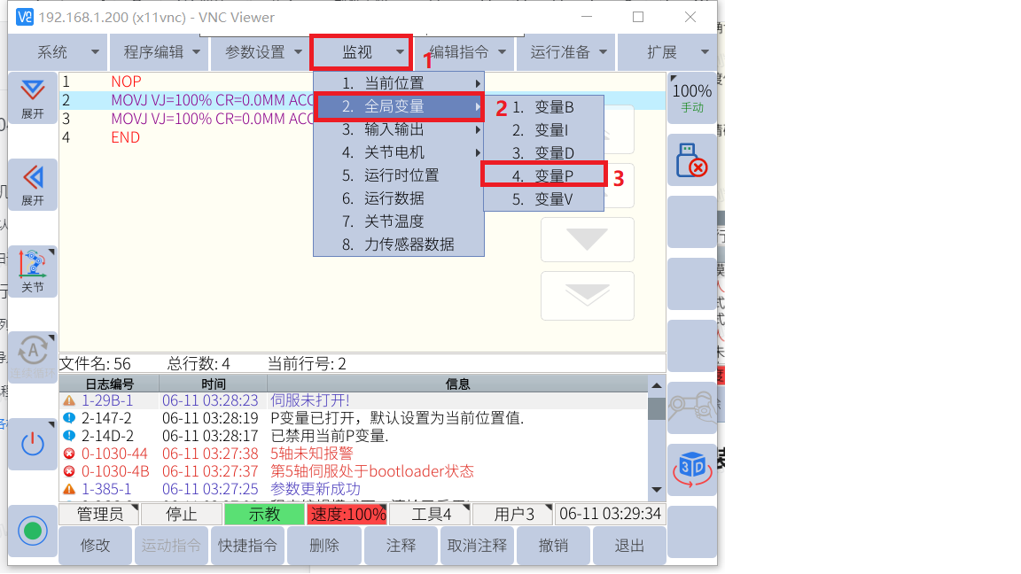 可以用p變量里輸入6個關節(jié)角度回打包位,如下圖步驟選用一個未使用的P變量并打開。根據(jù)圖片標簽步驟執(zhí)行。
